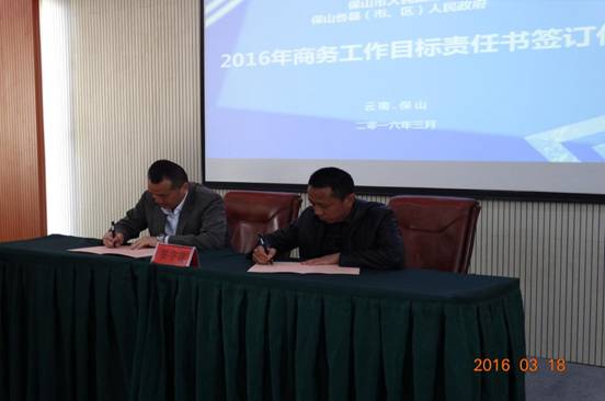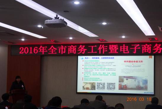 会上,王德山局长作了商务工作报告;表彰奖励了2015年度商务工作先进单位暨电子商务示范企业;市人民政府以各县、市、区人民政府签订了2016年商务工作目标责任书。腾冲市人民政府、滇西电子商务产业园和保山云雾清凉商贸有限公司等三家单位就推进电子商务工作进行了交流发言。