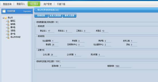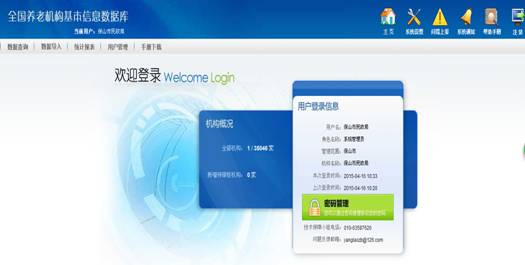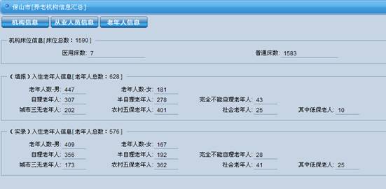保山市建立了养老机构数据直报系统,目前对养老机构基本信息数据库直报系统进行录入,全市已录入30个养老机构、1590张床位、183名从业人员、576名入住老年人的基本信息。市民政局与市卫计委合作,全市已完成156100名老年人健康管理工作。2013年底保山市机构养老信息化服务覆盖率为3%,到2014年底达10%。
